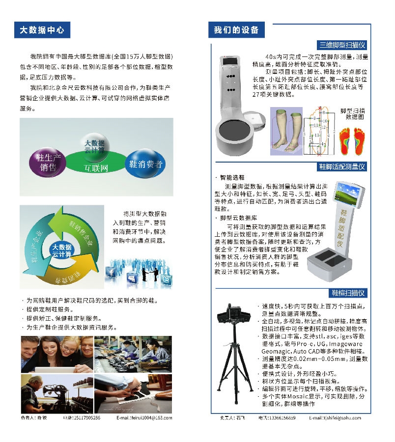 腳型數(shù)據(jù)與足履適配聯(lián)合實(shí)驗(yàn)室為中國皮革和制鞋工業(yè)研究院與北京金尺云數(shù)科技有限公司聯(lián)合成立。實(shí)驗(yàn)室通過海量采集中國人腳型三維數(shù)據(jù)及足底壓力數(shù)據(jù),并進(jìn)行分析、處理,形成服務(wù)于行業(yè)的大數(shù)據(jù)平臺(tái)。在大數(shù)據(jù)和足履適配的研究基礎(chǔ)上,為傳統(tǒng)的鞋類生產(chǎn)、銷售企業(yè)提供第三方服務(wù);為購鞋者、鞋類生產(chǎn)、銷售廠家解決生產(chǎn)、流通和買賣之間的痛點(diǎn)問題,并提供大數(shù)據(jù)支持服務(wù)。