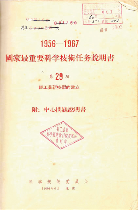 1955年,在周恩來總理親自領(lǐng)導(dǎo)下,國務(wù)院成立科學(xué)規(guī)劃委員會,組織制定《1956—1967年科學(xué)技術(shù)發(fā)展遠(yuǎn)景規(guī)劃綱要》。1956年,《綱要》編制完成,從13個方面提出了57項重大科學(xué)技術(shù)任務(wù),其中第29項就是輕工業(yè)新技術(shù)的建立。中輕集團(tuán)多個所屬單位前身便由此相繼成立。