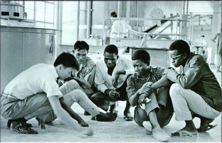 圖為1967年中國專家在糖廠車間就地畫圖為工人講解生產(chǎn)技術(shù)。