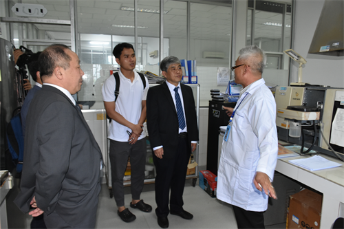 曹春昱一行首先來到柬埔寨國家科學技術創(chuàng)新實驗室(STINL),參觀水化學檢測室、重金屬元素分析室、果汁及啤酒中試車間等實驗室場所,詳細了解“一帶一路”聯(lián)合實驗室運行情況及此前中方援助設備使用情況。