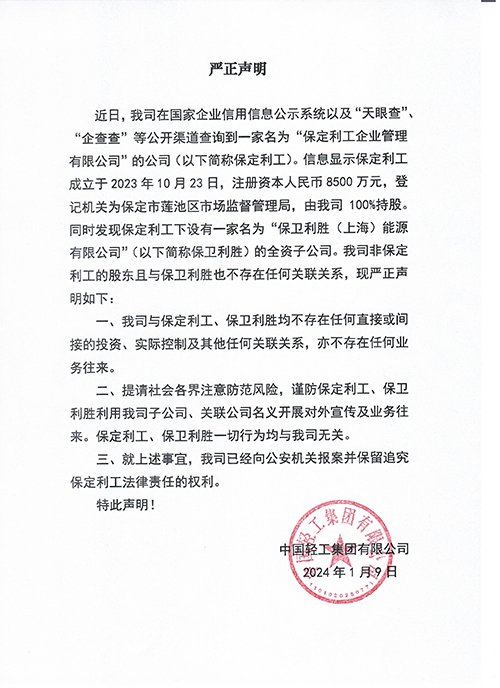 近日,我司在國家企業(yè)信用信息公示系統(tǒng)以及“天眼查”、“企查查”等公開渠道查詢到一家名為“保定利工企業(yè)管理有限公司”的公司(以下簡稱保定利工)。信息顯示保定利工成立于2023年10月23日,注冊資本人民幣8500萬元,登記機(jī)關(guān)為保定市蓮池區(qū)市場監(jiān)督管理局,由我司100%持股。同時發(fā)現(xiàn)保定利工下設(shè)有一家名為“保衛(wèi)利勝(上海)能源有限公司”(以下簡稱保衛(wèi)利勝)的全資子公司。我司非保定利工的股東且與保衛(wèi)利勝也不存在任何關(guān)聯(lián)關(guān)系,現(xiàn)嚴(yán)正聲明如下: