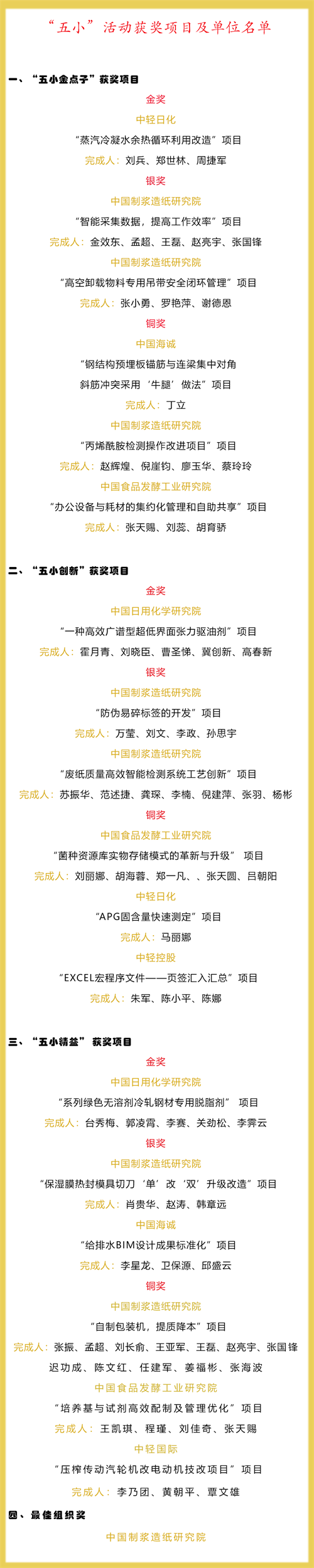 2023年,保利中輕各級(jí)工會(huì)積極組織,廣大員工踴躍參加,共征集各類(lèi)創(chuàng)新成果45項(xiàng),涵蓋產(chǎn)品研發(fā)、施工工藝、精益管理等多個(gè)領(lǐng)域。保利中輕工會(huì)經(jīng)過(guò)初選和現(xiàn)場(chǎng)答辯,評(píng)選出“五小金點(diǎn)子”“五小創(chuàng)新”“五小精益”三個(gè)類(lèi)別中的金獎(jiǎng)、銀獎(jiǎng)和銅獎(jiǎng)18個(gè)獎(jiǎng)項(xiàng),最佳組織獎(jiǎng)1個(gè)獎(jiǎng)項(xiàng)。