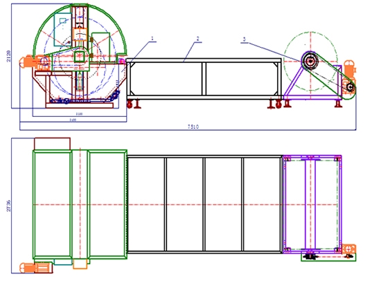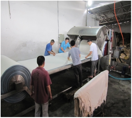針對使用轉(zhuǎn)鼓進行鞣制時,存在的皮張面積會縮小、皮革粒面容易變粗、大量皮屑和皮蛋白脫離皮革進入鞣液中與鞣劑結(jié)合,降低鞣劑的鞣性,影響鞣制廢液的循環(huán)利用等問題,設(shè)計、制造由帶有傳動系統(tǒng)的鞣制輥和裝/卸皮輥,壓力輥、操作臺、傳送帶、鞣制槽等組成的皮革鞣制機,代替轉(zhuǎn)鼓進行皮革的鞣制。